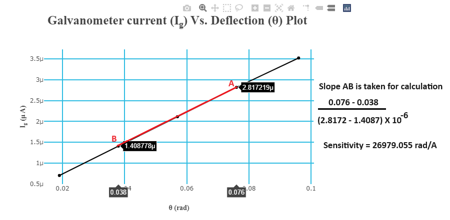 $$Sensitivity \ (rad/A) = \frac{difference \ in \ deflection \ (say \ \Delta\theta)}{ \ difference \ in \ galvanometer \ current \ \Delta I_g \times 10^{-6} }$$