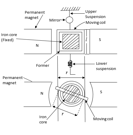It is the current carrying element. It is either rectangular or circular in shape and consists of a number of turns of fine wire. This coil is suspended so that it is free to turn about its vertical axis of symmetry. It is arranged in a uniform, radial, horizontal magnetic field of a permanent magnet and iron core. The iron core is spherical in shape if the coil is circular but is cylindrical if the coil is rectangular. The iron core is used to provide a flux path of low reluctance and therefore to produce strong magnetic field. This increases the deflecting torque and hence the sensitivity of the galvanometer. The length of air gap is about 1.5 mm.