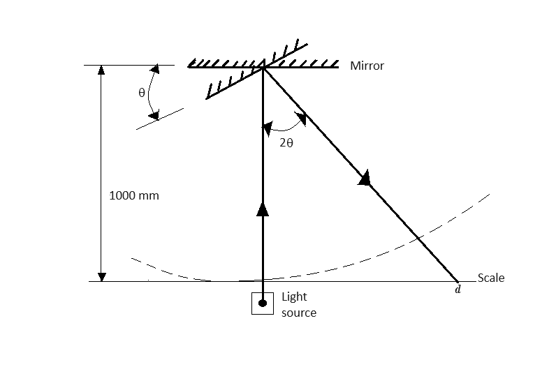 The beam of light is reflected on the scale upon which the deflection is measured. The scale is calibrated in mm and usually kept 1 m (1000 mm) away from the mirror as shown in Fig. 2.