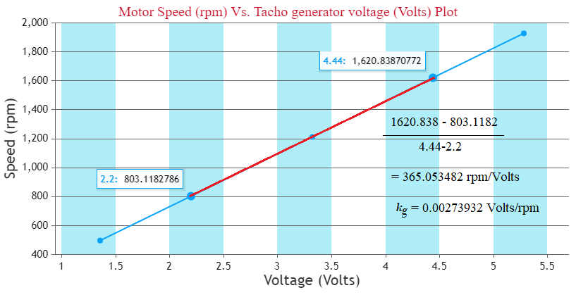 - Calculate the tacho generator constant (kg) from the slope in 'Motor Speed (rpm) Vs. Tacho generator voltage (Volts)' plot as shown in Fig. 2.