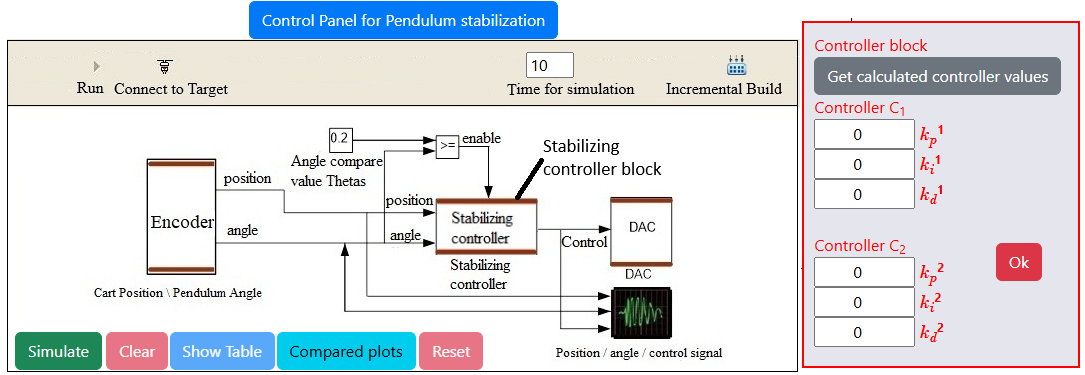 - Click on "Stabilizing controller" block in the control panel, click on 'Get calculated controller values' button. The controller values will be visible in respective boxes in controller block. Click on 'Ok'.