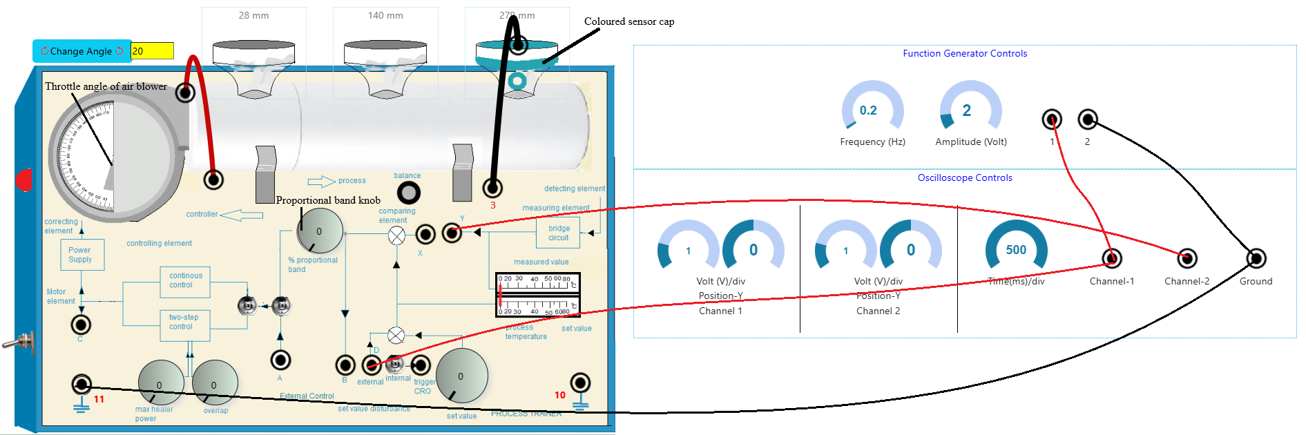 - Now click on 'Clear' button. Angle can be changed to 60, 80 ° and observe output for different angles as well as different proportional bands following steps 3-7.