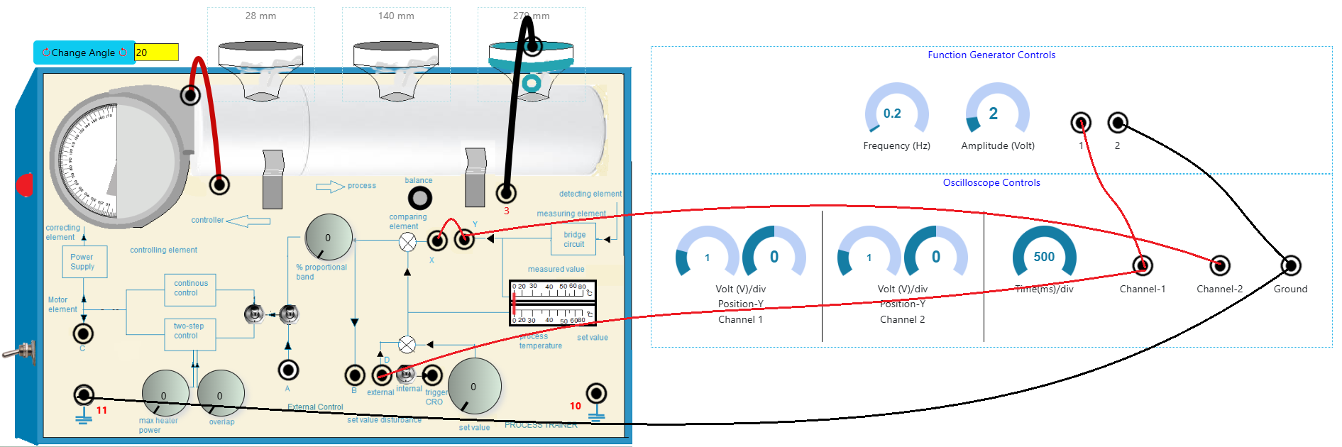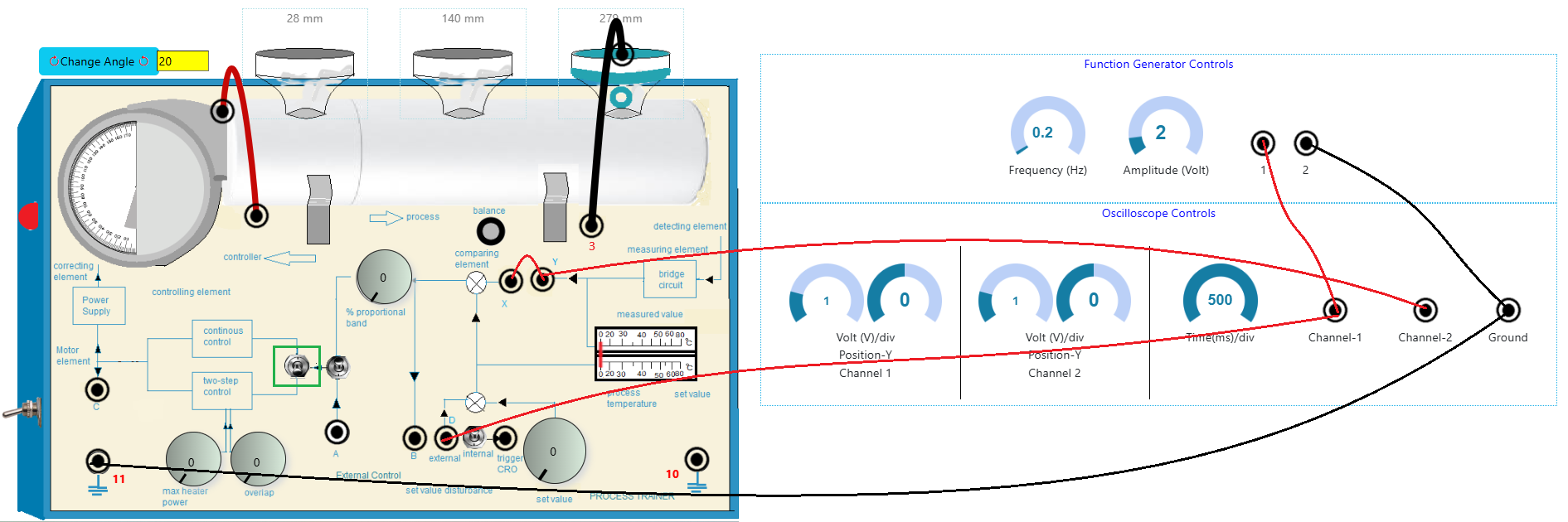 - First make the wire connection properly through the connecting dots (black dots) in the process trainer kit and in the oscilloscope controls section (Fig. 2) in simulation section, following the below instructions.