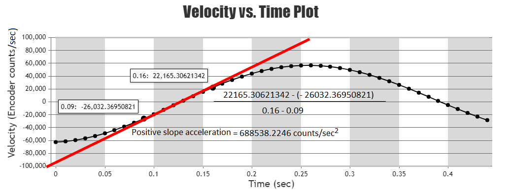 - To calculate acceleration first assume a positive-sloped linear segment (two points on positive slope forming straight line) from velocity vs. time plot.