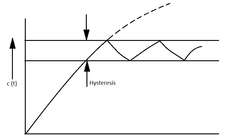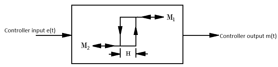 It is also reffered to as two position controllers, consist of a simple and inexpensive switch/relay and are, therefore, used very commonly in both industrial and domestic control systems. Typical applications include air-conditioner and refrigerators, ovens, heaters with thermostat. Solenoid operated two position valves are commonly used in hydraulic and pneumatic systems. The basic input-output behaviour of this controller is shown in Fig. 7. The two positions of the controller are M1 and M2, and H is the hysteresis or differential gap. The hysteresis is necessary, as it enables the controller output to remain at its present value till the input or error has increased a little beyond zero. Hysteresis helps in avoiding too frequent switching of the controller, although a large value results in greater errors. The response of the system with ON-OFF controller is shown in Fig. 8. Describing function technique is a standard method for the analysis of non-linear systems, for instance, one with an ON-OFF controller.